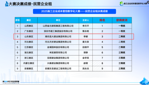 近日,備受建筑行業(yè)關(guān)注的“2025施工企業(yè)成本管控?cái)?shù)字化大賽總決賽暨頒獎(jiǎng)典禮”在北京圓滿(mǎn)落幕。集團(tuán)公司憑借扎實(shí)的成本數(shù)字化實(shí)踐成果,從全國(guó)近三千家參賽企業(yè)中脫穎而出,最終斬獲民營(yíng)企業(yè)整體排名第三、民營(yíng)企業(yè)組二等獎(jiǎng)的優(yōu)異成績(jī)。